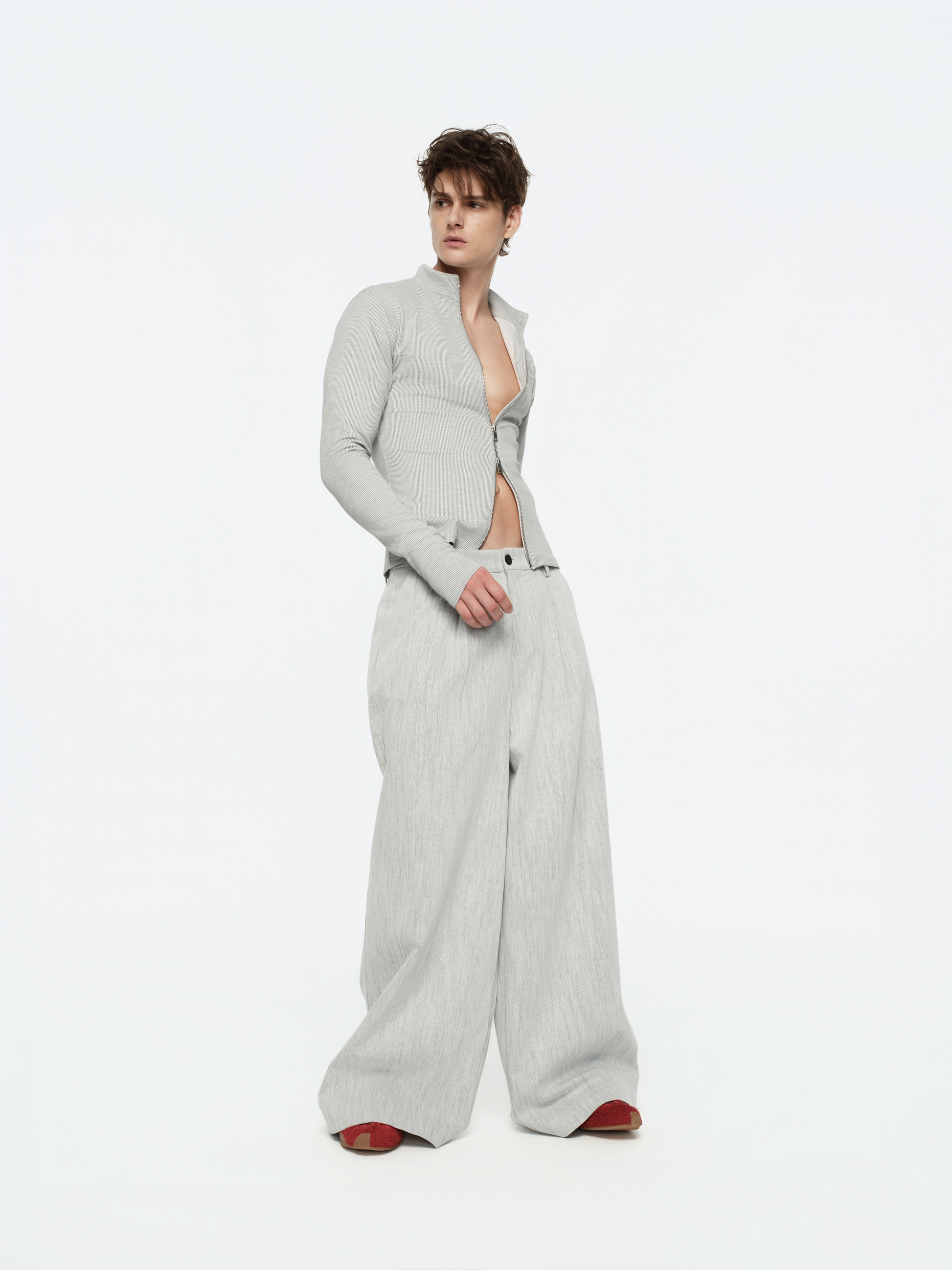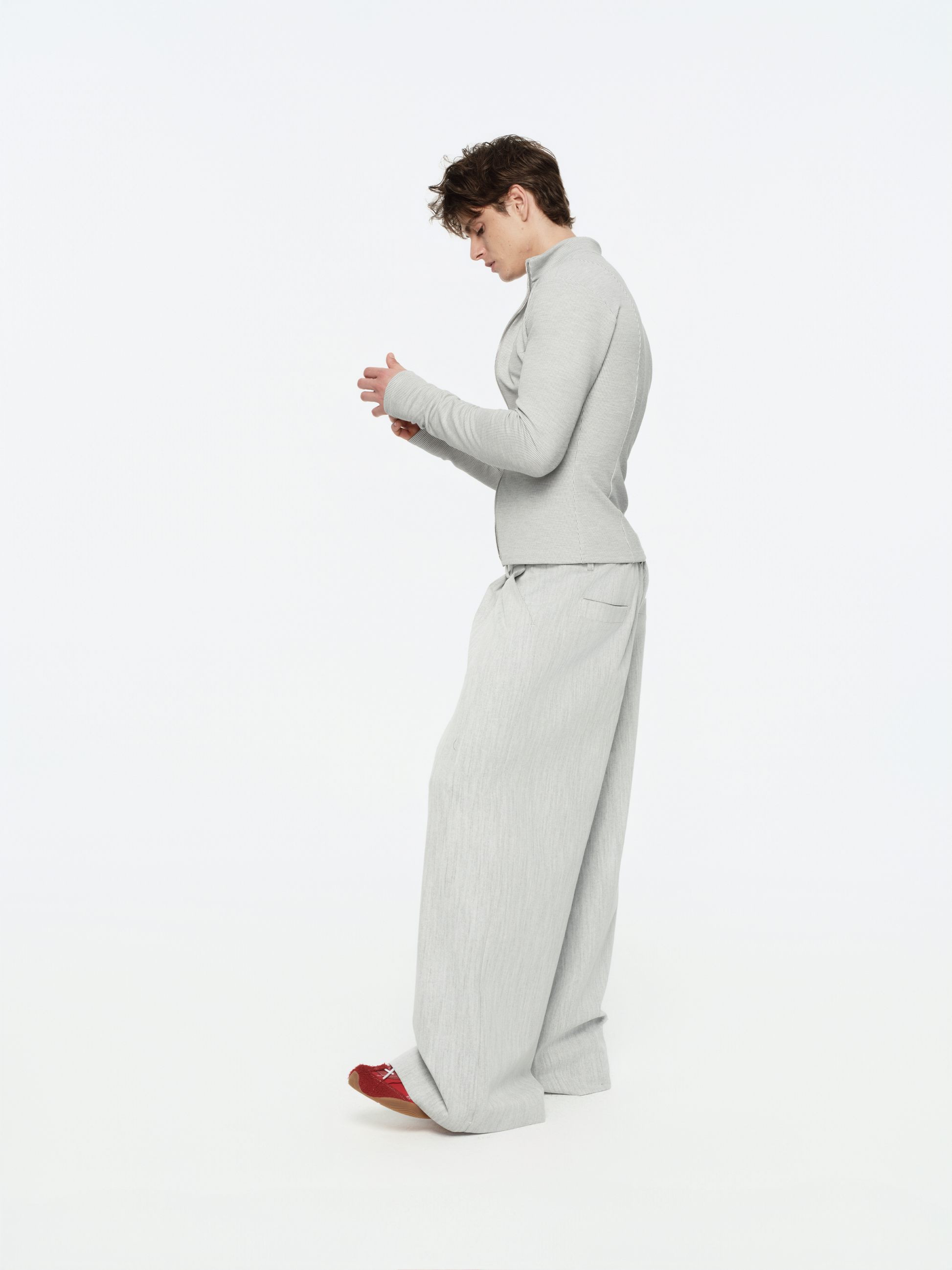 Loose tailoring and darted seams shape a relaxed yet refined drape.