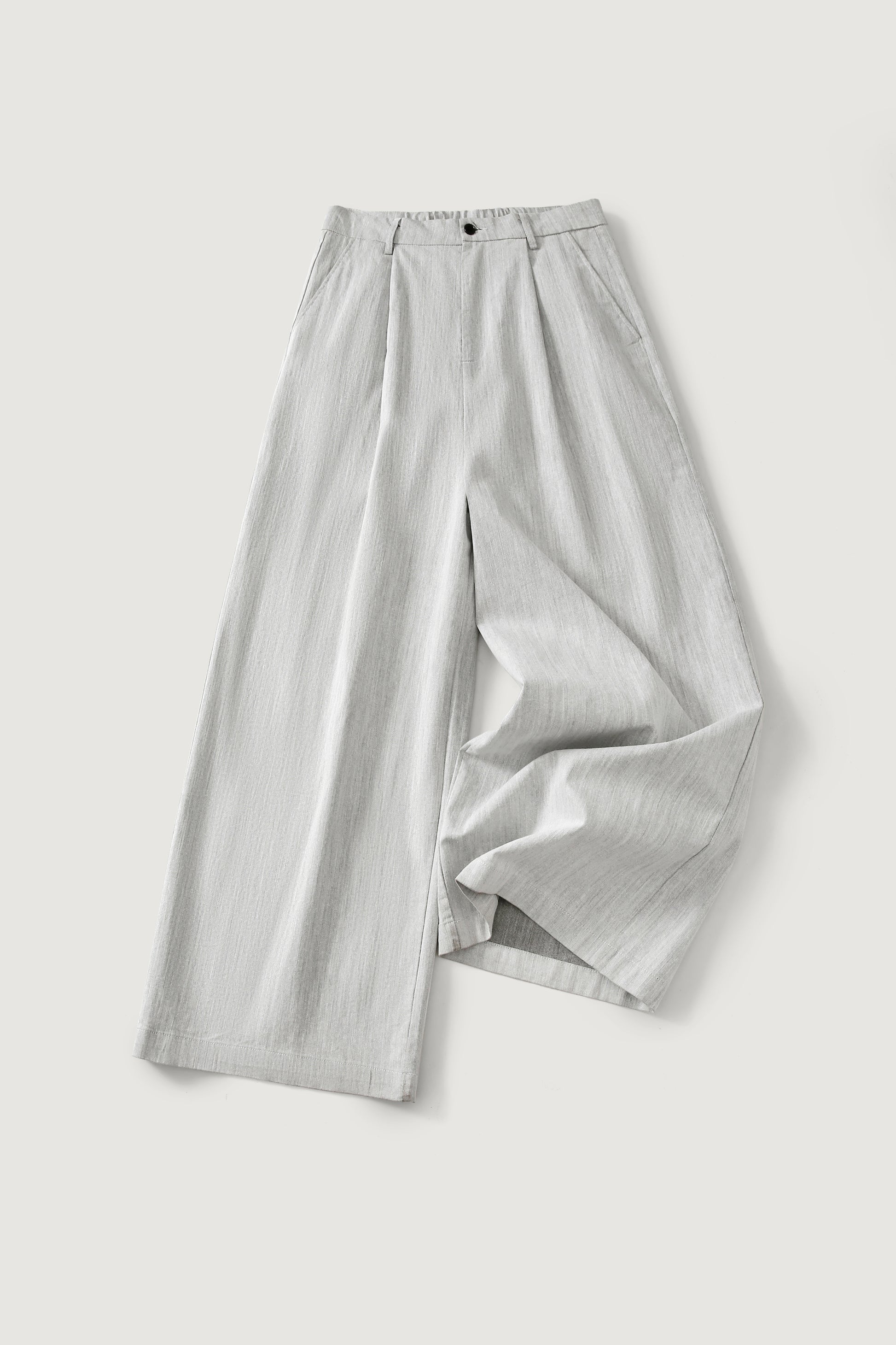 A breathable linen-cotton-poly blend offers the look of denim with a lighter, airier feel.