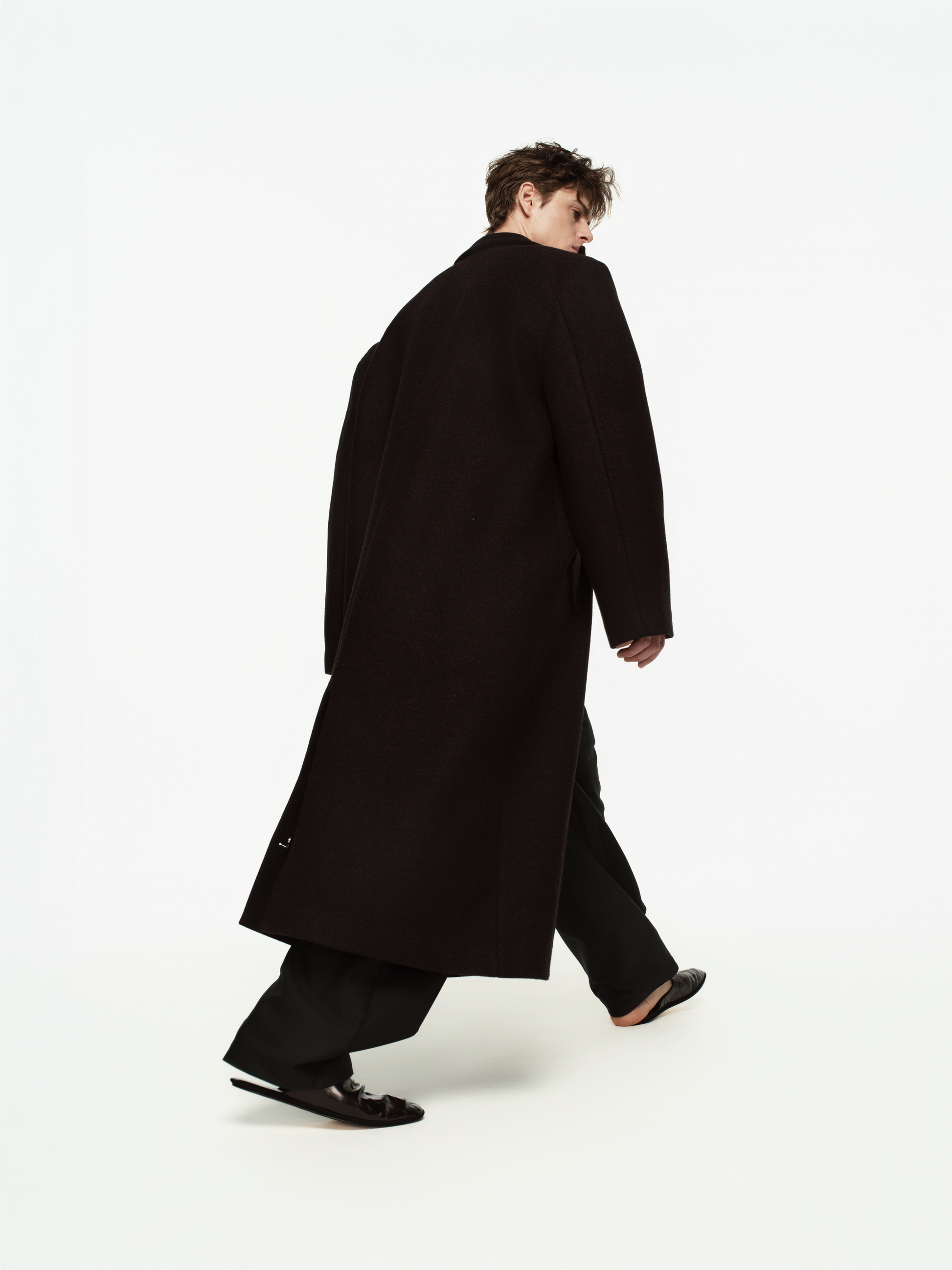 The Ember Coat brings volume and softness into balance. Its wide cut lets the shoulder line fall with natural arcs, while calculated pleats at the back create controlled looseness. The wool-blend fabric carries a velvet-like touch with subtle friction, shaping a silhouette that flows with every move. In black-red, the coat projects quiet strength, its folds catching light and shadow to redefine presence with understated power.