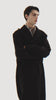 The Ember Coat brings volume and softness into balance. Its wide cut lets the shoulder line fall with natural arcs, while calculated pleats at the back create controlled looseness. The wool-blend fabric carries a velvet-like touch with subtle friction, shaping a silhouette that flows with every move. In black-red, the coat projects quiet strength, its folds catching light and shadow to redefine presence with understated power.