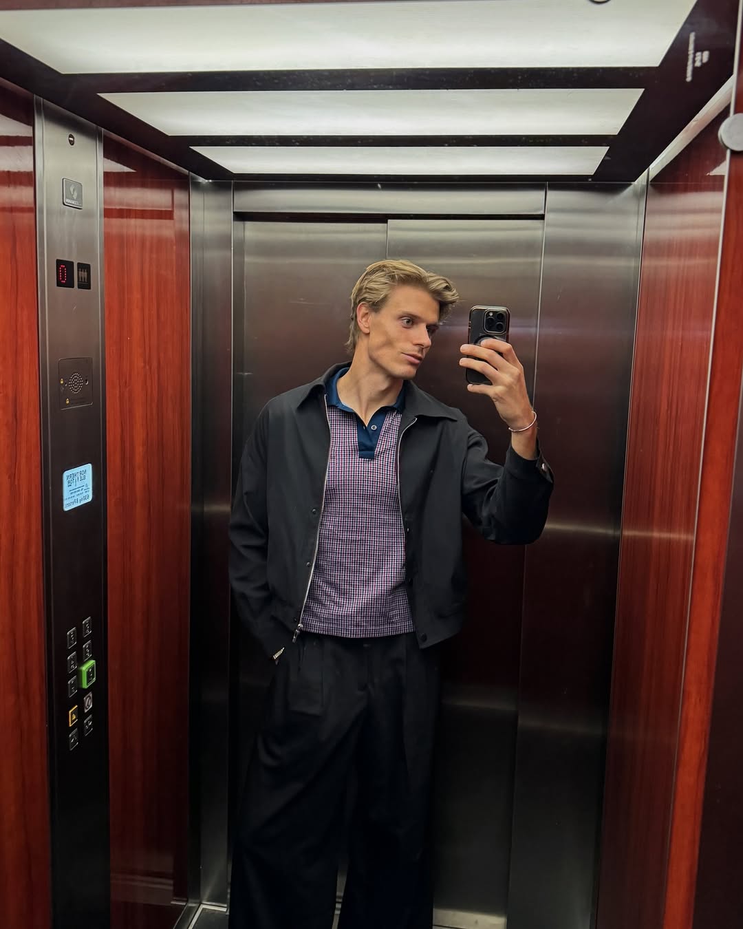 Dropped shoulders create a relaxed volume, while hidden tucks along the waist subtly redirect force toward a downward cascade. The clean-cut front placket resembles a fault line—precise, abrupt, and architectural.
